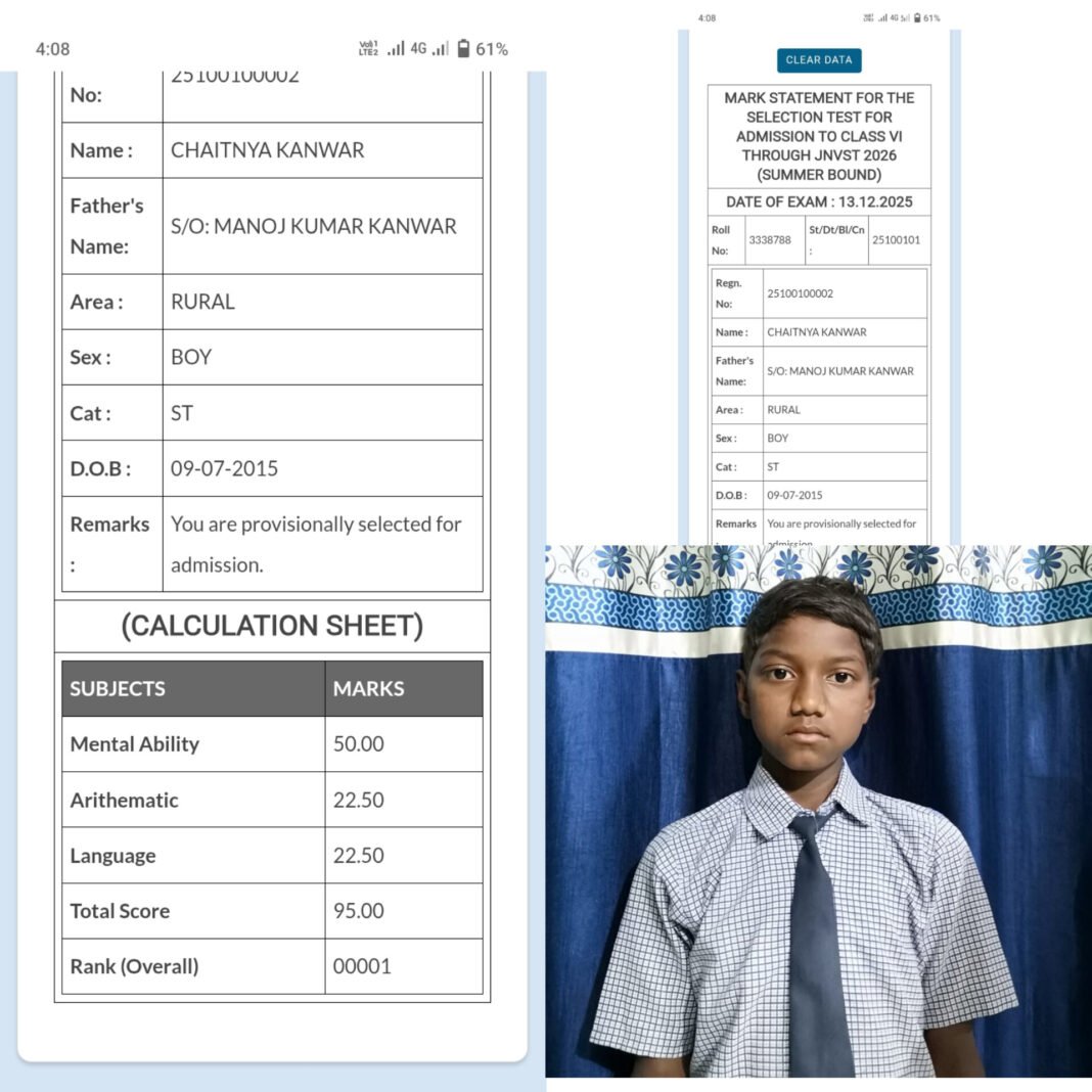प्राथमिक शाला कुरूडीह के छात्र चैतन्य कंवर ने नवोदय चयन परीक्षा में कोरबा जिले में पाया प्रथम स्थान