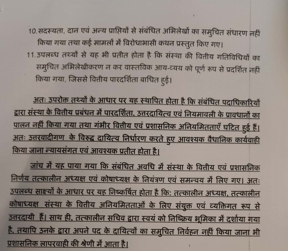 जांच अधिकारी ने अपनी रिपोर्ट में स्पष्ट रूप से वित्तीय एवं प्रक्रियात्मक अनियमितताओं की पुष्टि करते हुए संबंधित पदाधिकारियों से पूरी राशि संस्था के बैंक खाते में जमा कराने की अनुशंसा की है।