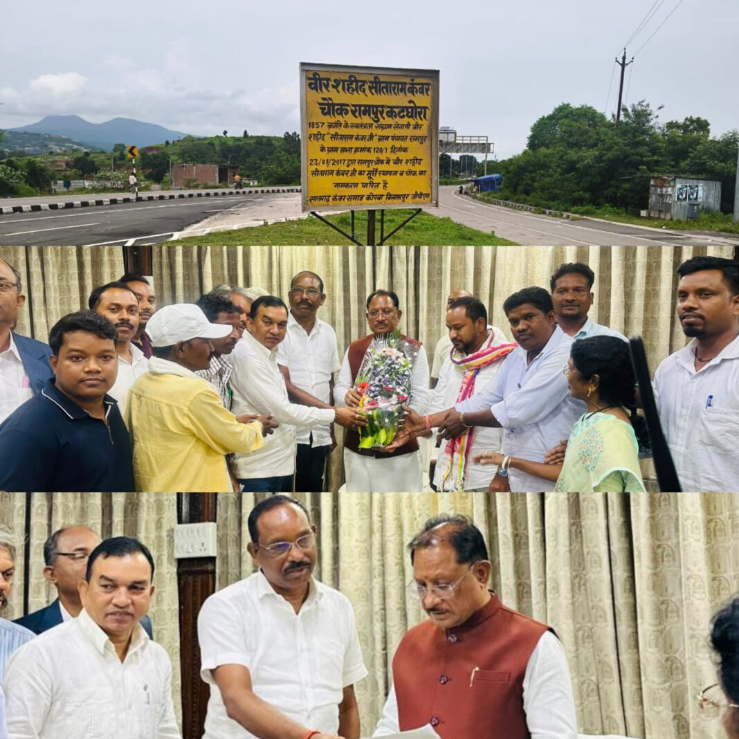 कटघोरा: स्वतंत्रता संग्राम सेनानी 1857 क्रांतिकारी शहिद सीताराम कंवर जी के सम्मान में आदिवासी बहुल्य क्षेत्र कोरबा में कटघोरा अंबिकापुर मार्ग ग्राम पंचायत रामपुर चौंक में आधार स्तंभ एवं मूर्ति स्थापना करने के संबंध में आज जिला कोरबा के कंवर आदिवासी समाज के केंद्रीय अध्यक्ष छत्रपाल सिंह कंवर, के नेतृत्व में भारी संख्या में सियान और युवा प्रभाग के सदस्य ने छत्तीसगढ़ शासन माननीय मुख्यमंत्री जी से सौजन्य मुलाकात कर सीताराम कंवर चौक ग्राम पंचायत रामपुर चकचकवा के पास आधार स्तंभ निर्माण एवं मूर्ति स्थापना शिलान्यास के संबंध में विस्तृत चर्चा हुआ,विषय की गंभीरता और कंवर समाज,आदिवासी समाज की जन्म भावनाओं को ध्यान में रखते हुए मुख्यमंत्री जी ने उक्त चौक में आधार स्तंभ निर्माण करने की बात हुई और आने वाले 9 अक्टूबर 2025 को 1857 के क्रांतिकारी वीर सहित सीताराम कंवर जी का मूर्ति स्थापना शिलान्यास मुख्यमंत्री जी के कर कमलों से करने की सहमति बनी।