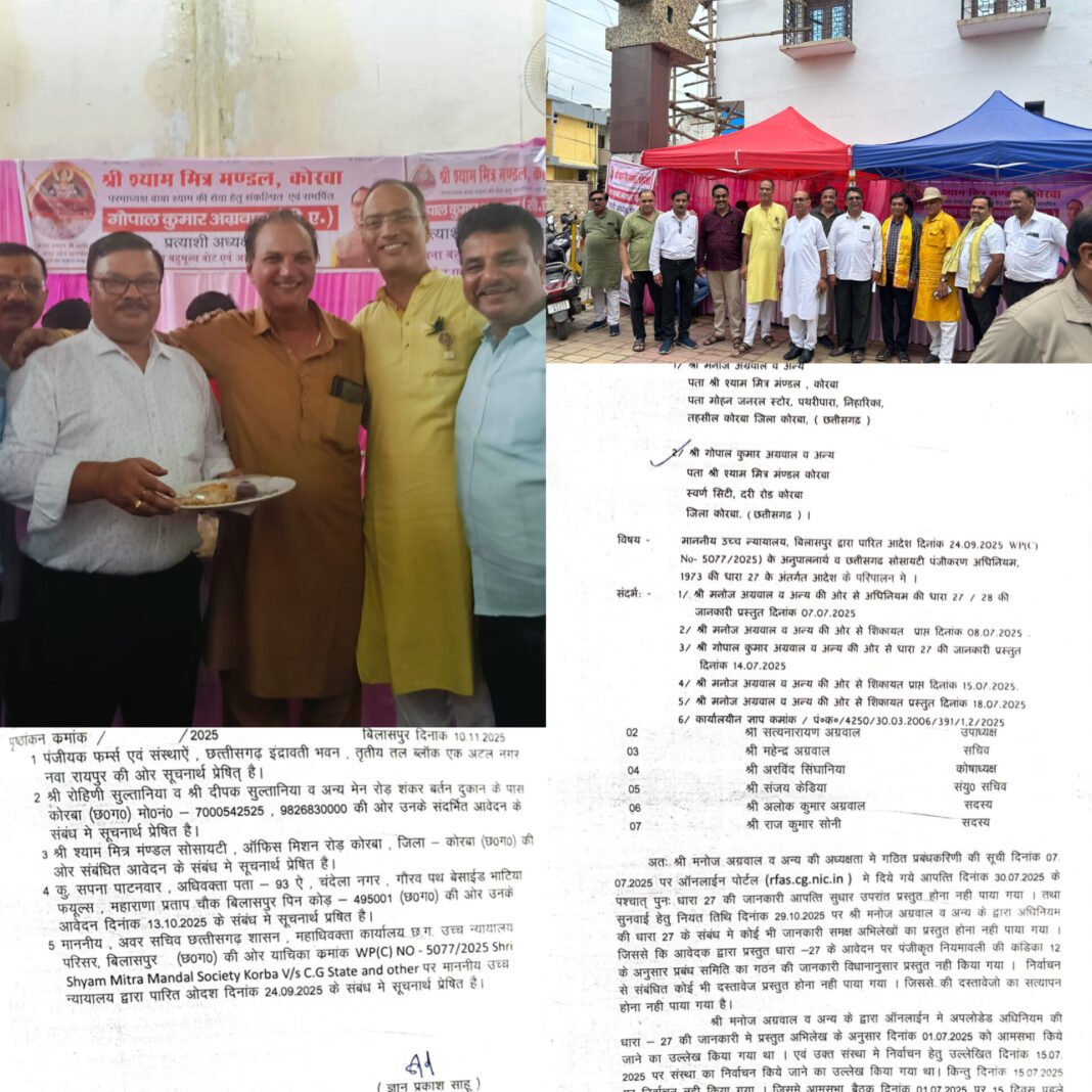 माननीय उच्च न्यायालय, छत्तीसगढ़ के आदेश (WPC 6329/2025) के अनुपालन में, माननीय पंजीयक महोदय, रायपुर द्वारा दिनांक 02 जून 2025 को एक महत्वपूर्ण आदेश पारित किया गया, जिसके अंतर्गत दिनांक 01 अक्टूबर 2024 को गठित मनोज अग्रवाल उर्फ मनी की कार्यकारिणी को अग्राह्य (अमान्य) घोषित किया गया और संस्था को 45 दिवस में नये निर्वाचन कराने के निर्देश दिए गये। उक्त आदेश के परिपालन में, दिनांक 10 जुलाई 2025 को निर्वाचन अधिकारी, सभापति नगर पालिका निगम नूतन सिंह ठाकुर की देखरेख में एवं पुलिस प्रशासन की उपस्थिति में विधिपूर्वक निर्वाचन प्रक्रिया अपनाते हुए श्री श्याम मित्र मंडल, कोरबा का निर्वाचन संपन्न कराया गया, जिसमें सी.ए. श्री गोपाल अग्रवाल भारी बहुमत से विजयी घोषित हुए। वहीं दूसरी ओर, पूर्व अमान्य कार्यकारिणी द्वारा तथ्यों को भ्रामक रूप से प्रस्तुत करते हुए दिनांक 01 जुलाई 2025 को स्वयंभू कार्यकारिणी का गठन किया गया और दिनांक 07 जुलाई 2025 को माननीय सहायक पंजीयक, फर्म्स एंड सोसायटीज़, बिलासपुर ज्ञान प्रकाश साहू) के समक्ष धारा 27 के अंतर्गत विवरण प्रस्तुत कर दिया गया। दो अलग-अलग चुनाव संबंधी जानकारियाँ प्राप्त होने पर, माननीय सहायक पंजीयक महोदय द्वारा निष्पक्ष कार्यवाही हेतु दोनों पक्षों से अभिलेखों एवं साक्ष्यों की जांच हेतु पत्र जारी किए गए। परीक्षण के उपरांत को गोपाल अग्रवाल की कार्यकारिणी को वैद्य माना गया।