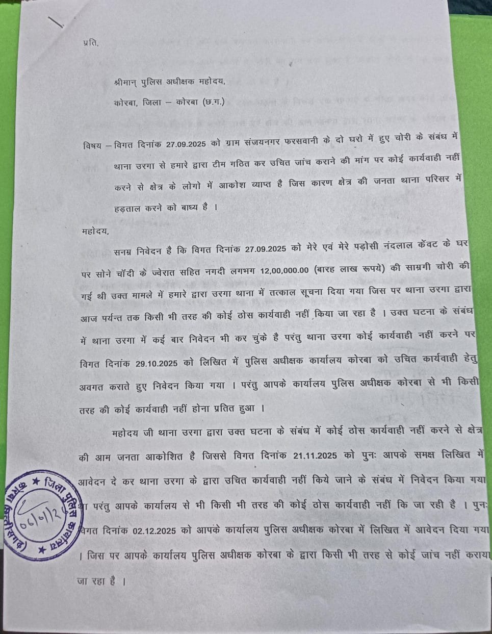 राकेश श्रीवास द्वारा कोरबा पुलिस अधीक्षक जी को तीन बार विशेष टीम गठित करने की मांग की गई है लेकिन पुलिस अधीक्षक महोदय ने इस पर कोई ध्यान नहीं दिया और आज चौथी बार 06/01/2026 को, राकेश श्रीवास ने कहा कि एक सप्ताह के अंदर चोरी का सामान और चोर गिरोह नहीं पकड़ा गया तो उरगा थाना में अनिश्चितकालीन धरने पर बैठने को मजबूर होंगे